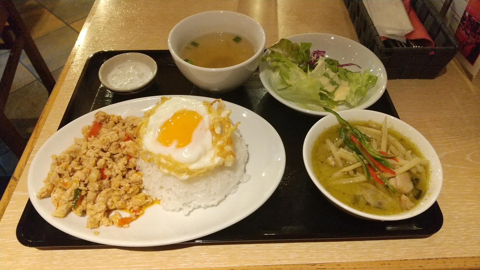 グリーンカレーとガパオライスセット 950円。名前の通りグリーンカレーとガパオライス、さらにスープ、サラダ、デザート付き。ガパオライスには目玉焼きもついてます。カレーもガパオも辛さは控えめですがちゃんとタイ料理の風味(激辛好きには物足りないかも知れませんが)。量も写真の通りたっぷり目で(某フードコートのタイ料理店は見習ってくれ…)、1,000円を切っているとは信じられない充実のランチです。他のランチセットも900円前後という大変コスパのよい店です。近くに東工大があるので学生さん向けに価格を抑えているのでしょうか?