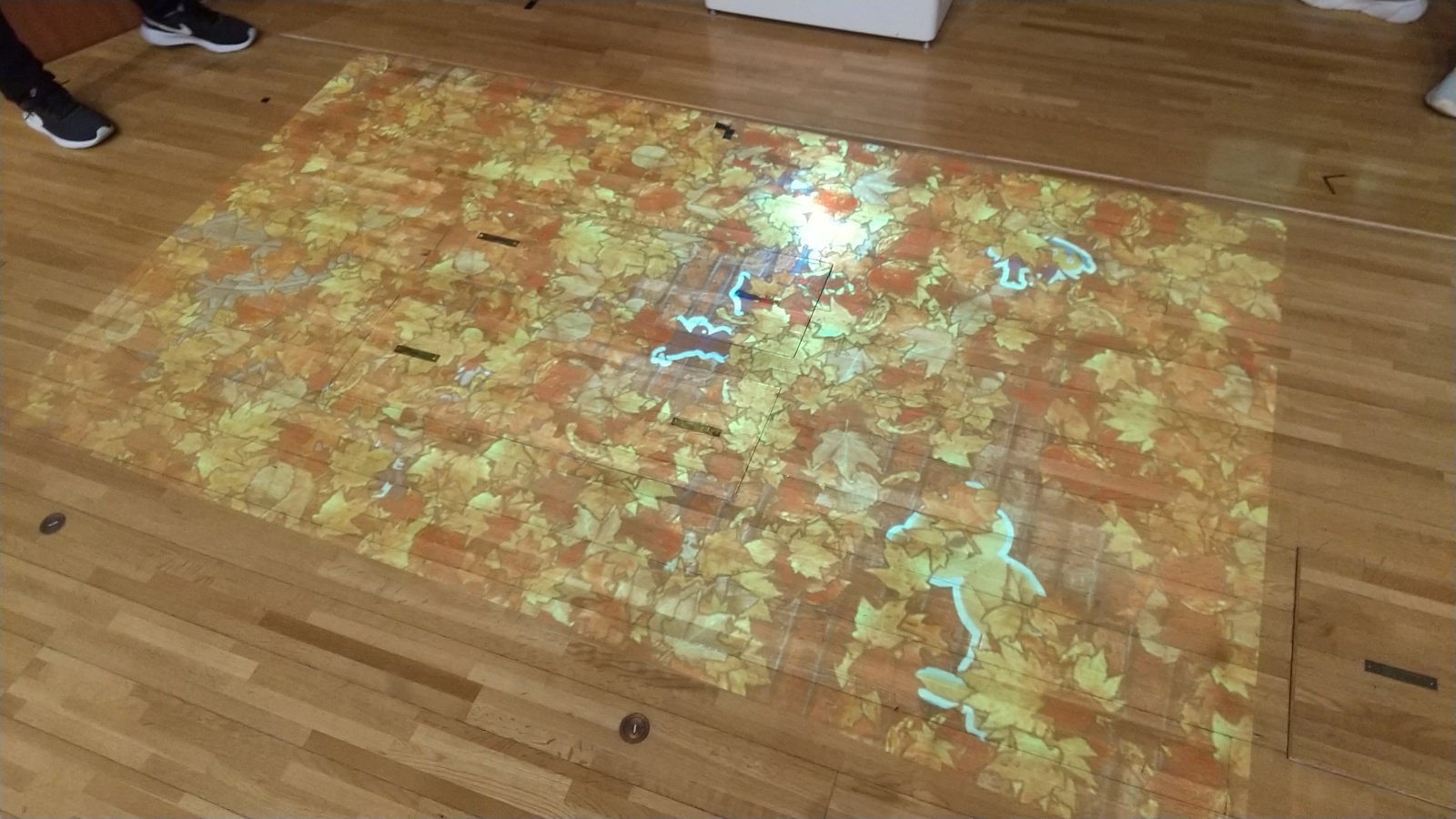『どーもくんデジタルマット』。床に落ち葉の積もった地面が投影されているのですが、足で落ち葉をかき分けていくとどーもくんのキャラクターが登場するというもの。なんとか6キャラクター全部発見。