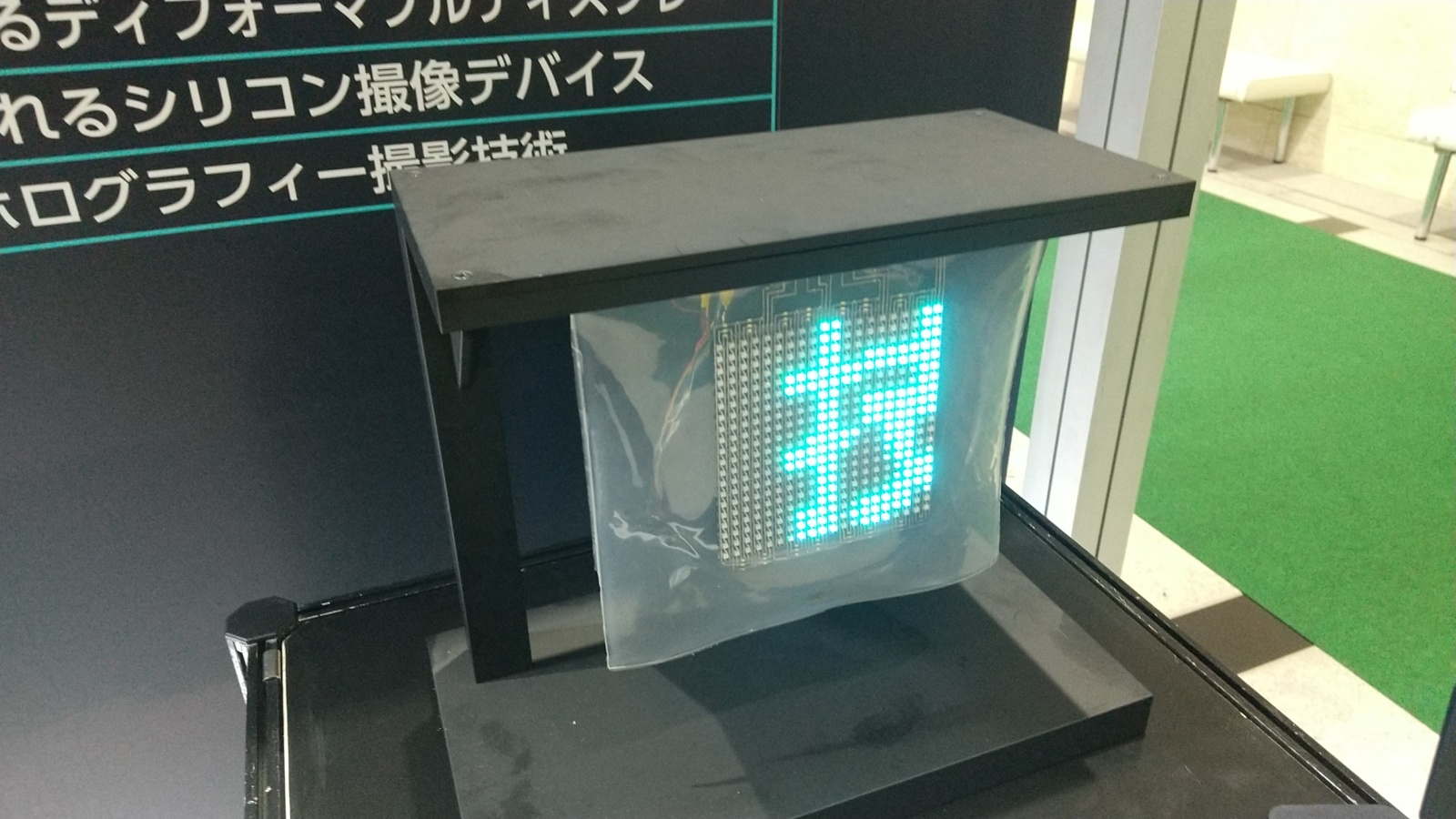柔らかい透明シート状のディスプレイ。厚手のビニールシートの表面に発光素子(LED)と配線がプリントされています。写真の通りまだ解像度は低いですが、自由に曲げられるのでいろいろ応用が出来そうです。