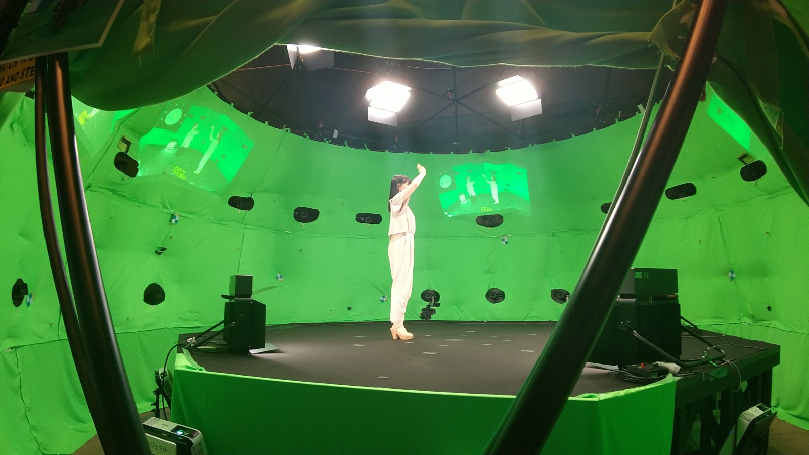 ポリュメトリック映像製作支援技術 の メタスタジオ。周囲をぐるっとグリーンバックに囲まれたドーム状のスタジオです。ドーム内に出演者が1人いるのですが、ここに別取りした共演者を合成して2人一緒にいるような映像を作成することが出来ます。共演者と合成された映像がドーム内にも投影されているため、現在スタジオ内にいる出演者は位置関係を確認することが出来るようになっています。しかも周囲360度、自由な角度から撮影可能。