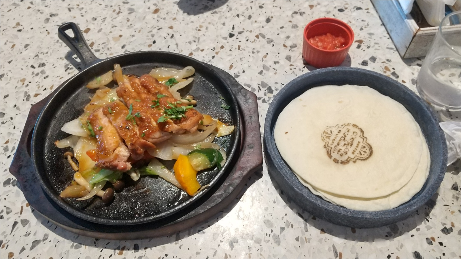 メインは選べます。今回はチキンのファヒータです。好みで野菜、サルサなどと一緒にトルティーヤに巻いて食べます。うーん、これは思ったよりボリューム不足だったな。写真の通りフライパンがスカスカで、メニューのイラストに較べるとかなりケチくさい印象になってしまいますね。