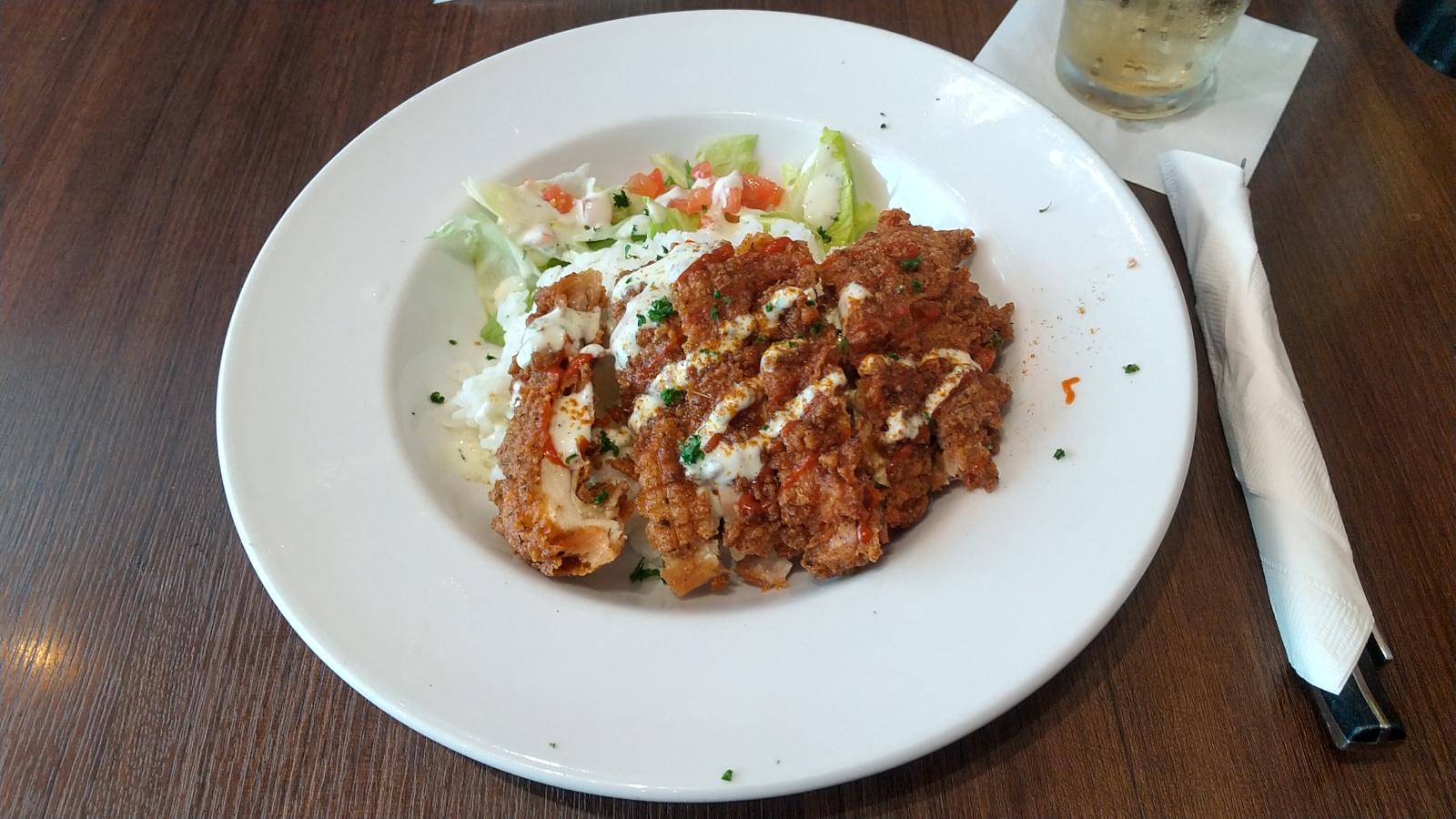 スパイシーチキンフリッター 900円。衣サクサクのチキンに、ピリ辛のシラチャソース(酸味のあるチリソース)がよく合っています。ランチタイムはライス・サラダとの盛り合わせで提供されていますが、税込み900円でこのボリュームとは非常にコスパが良いですね。