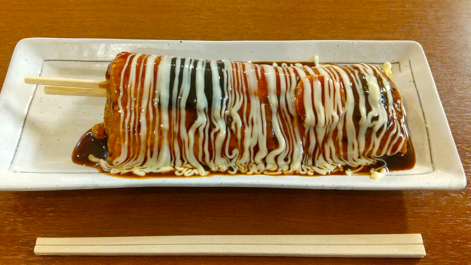 チーズどんどん(ソース)450円。どんどん焼きというのは山形独特の料理で、お好み焼きを割り箸に巻き付けたようなものです。写真では刺さっている箸の他にもう1膳箸が用意されていますが、刺さっている方を引き抜いて、もう一方で食べるということでした。