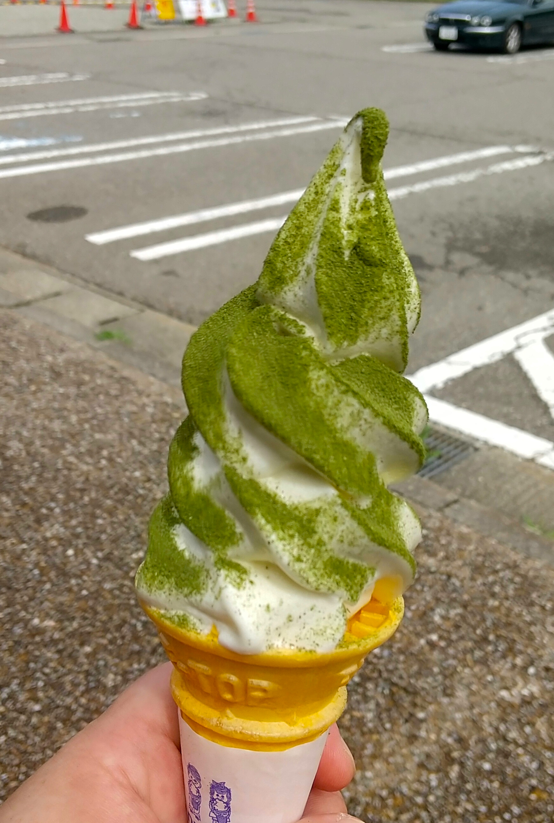 地元産のヨモギ粉のたっぷりとかかったヨモギ粉ソフトクリーム 460円。ヨモギの清涼感のある香りが不思議と冷たいソフトクリームによくあっています。炎天下の山城攻略で熱を持った身体にしみこむ…。