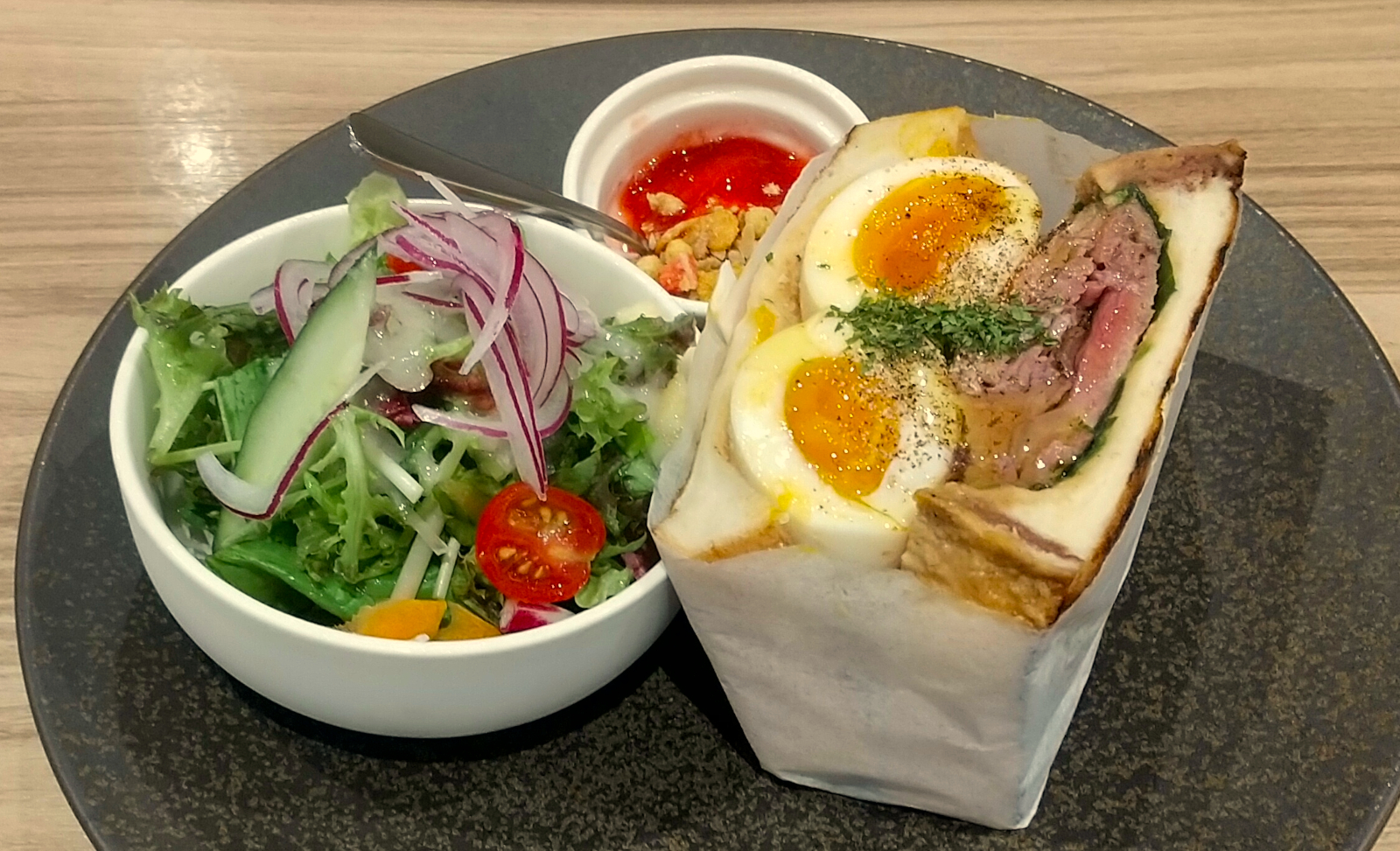 国産牛のローストビーフたまごサンドモーニング 1,780円。1日10食限定とのことなので、早い時間になくなってしまうのかもしれません。僕は開店直後に突入したのでまだありました。