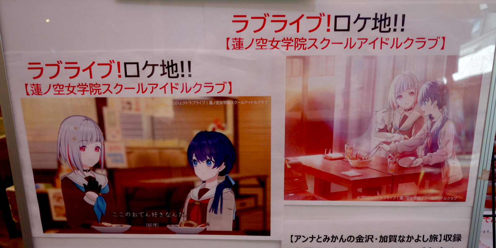 蓮ノ空の聖地巡礼でもありました。ネット番組『せーので!はすのそら!』103期第27回でドルケストラ(佐々木琴子さん、野中ここなさん)がいっぷくやを訪れて金沢おでんを食べています。