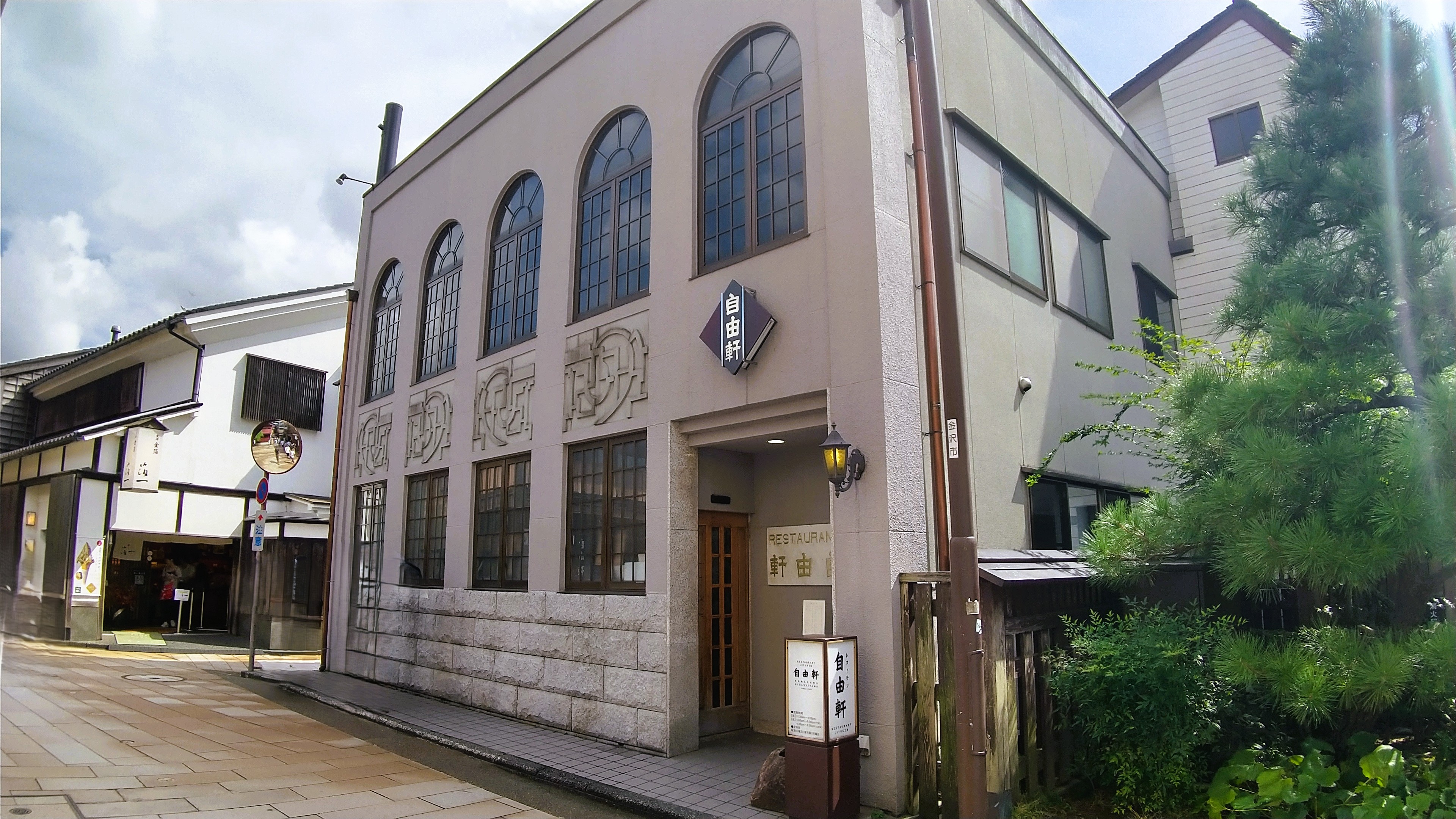 江戸時代の風情を残す金沢ひがし茶屋街の中心部にある広場に面した近代建築…江戸時代の中で1軒だけモダンな明治・大正の雰囲気、でも令和からみるとレトロという、ちょっと不思議な雰囲気の建物にある有名な洋食店 自由軒 へ行きました。『レトロ趣味』ではなく、明治時代の創業して110年以上の歴史を持つ本物の老舗です。