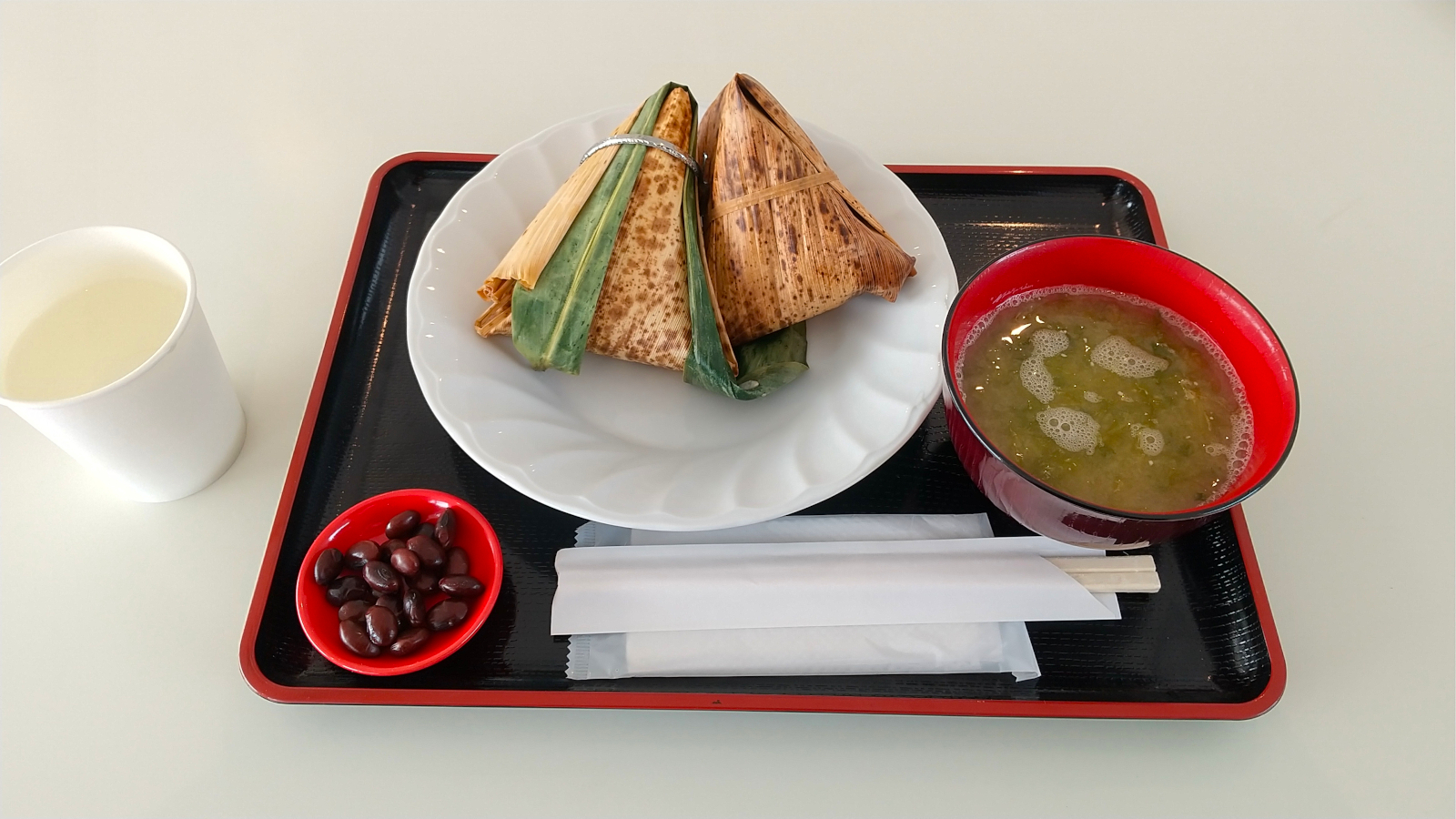 兜ちまきセット 1,100円。ちまき二種(舞茸・豚肉)、味噌汁付き。午前中に山歩きをしたせいで腹ぺこだったこともあってか、とても美味しく感じます。地元・上越産のコガネモチ米はしっとりもちもち。味噌汁もお腹に染み渡る!