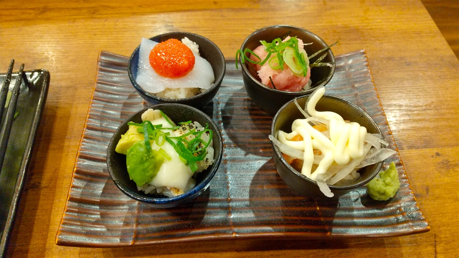 おちょこ寿司 4品盛り合わせ 605円。4種類一度に楽しめます。…が、1品1品はホントにちょびっとです(苦笑)。オニオンサーモン、ネギトロ、イカ明太子、あともう1品なんだっけ?白身の炙りっぽかったのですが。