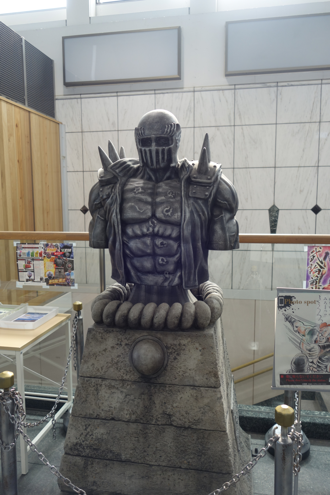 まず新幹線の改札近く(改札内)に、人気漫画『北斗の拳』のキャラクター・ジャギの胸像が。原作者の武論尊氏が佐久市出身という縁で、北斗の拳連載開始40周年となる2023年に佐久市とのコラボレーション事業として制作されたのだそうです。