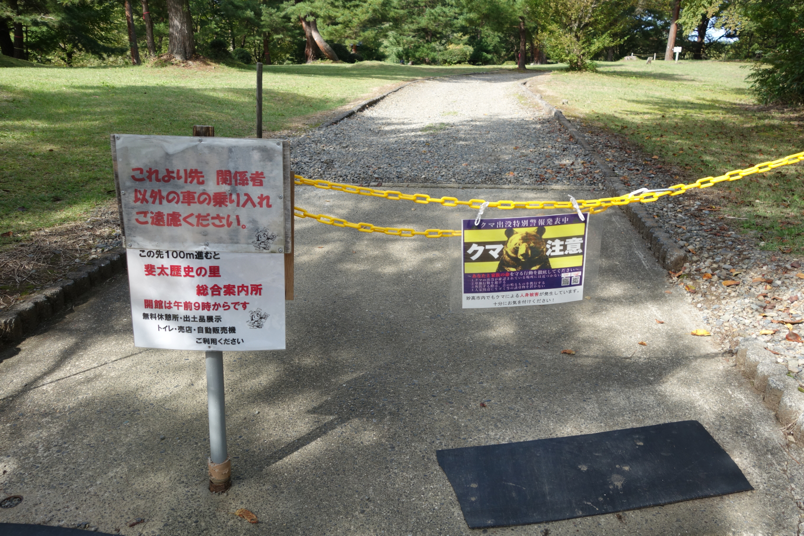 斐太歴史の里にたどりついてみたら、熊注意の掲示が出ています。今年(2025年)4月に登城路近くで熊が目撃されたとのことです。先月の鳥越城と違って完全な山道を長距離歩く必要があるので危険度は高いのに、実は熊スプレーが手配できず装備は熊鈴のみです。案内所で情報をしっかり聞かねば、場合によっては山に入るのを諦めてスタンプだけもらって帰るのも仕方ないか、と思いつつ先に進みます。