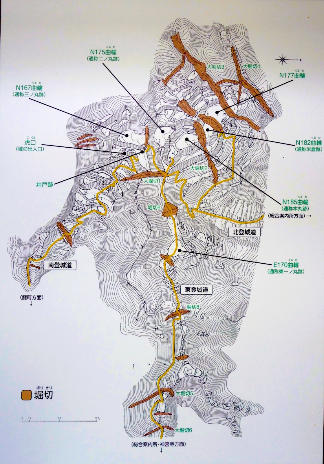 総合案内所はこの地図の下、紙面外です。東登城路(図の中央をほぼまっすぐ上に向かっている道)で登城し、城中枢部を見学した後は北登城路(図の中程で右へ向かっている道)で戻ってくるという、往路と復路でまったく違う道を通るのが推奨経路とのこと。