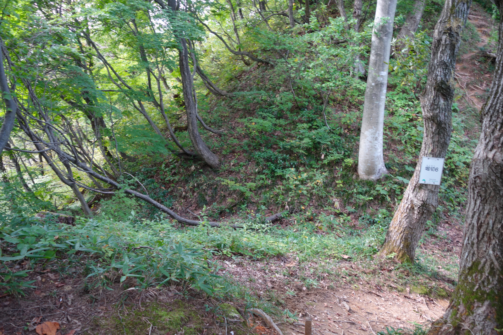 僕が見た感じでは、今回の登城路ではこの堀切が一番深いですね。そして堀切を超えた先の斜面の傾斜も今回の登城路でもっとも急で、登るのが結構大変です。…どうも『堀切』と『大堀切』という言葉の使い分けは幅や深さではなく長さのようですね。