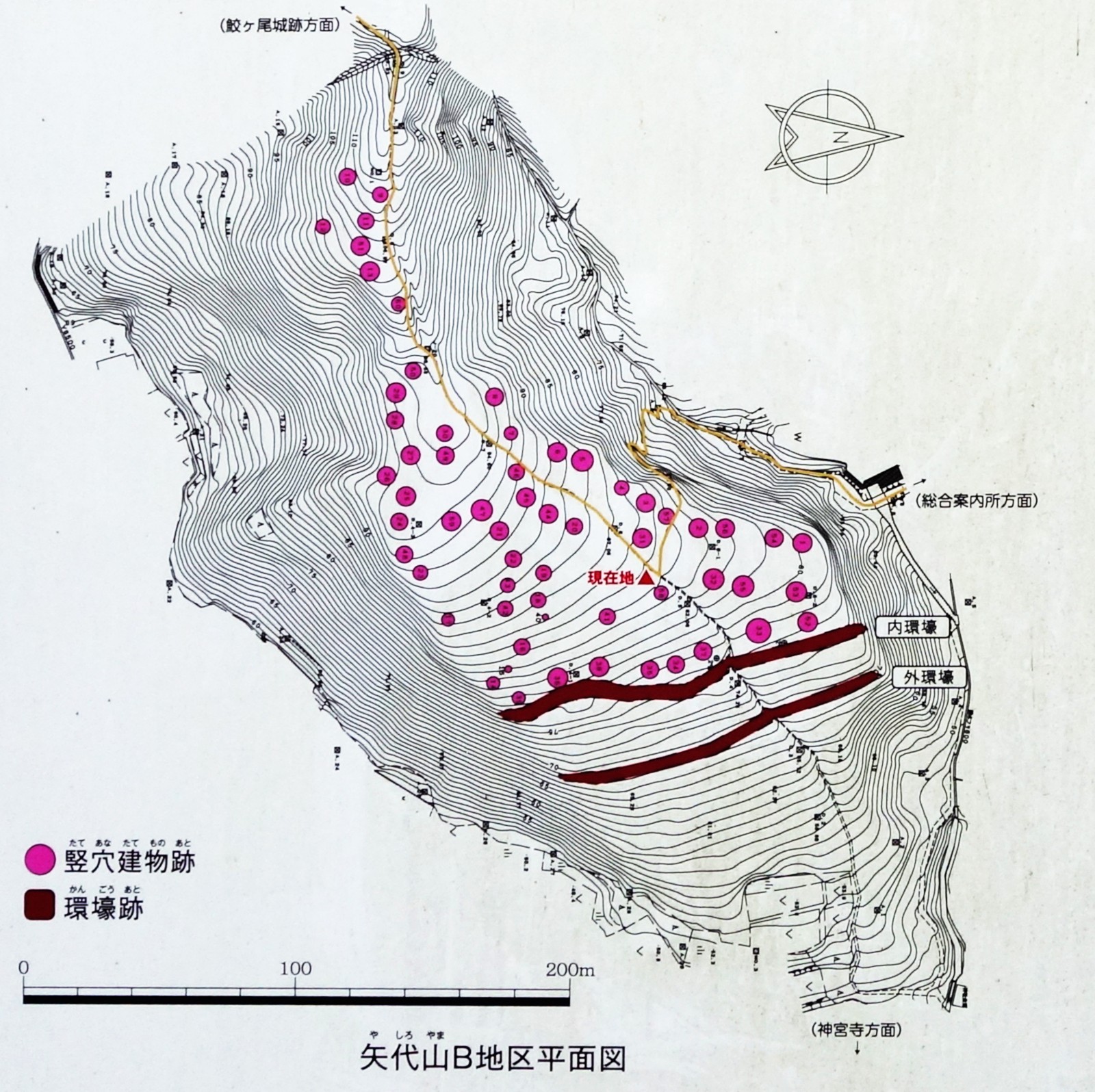 竪穴式住居跡の位置はこの図の通り。先の写真はだいたいこの図の『現在位置』の場所で、斜面上を向かって撮影しています。