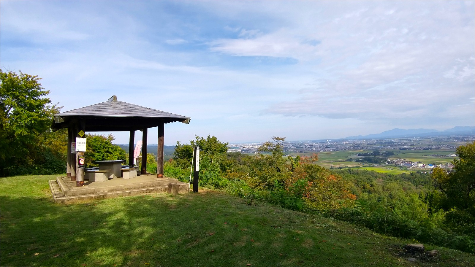 総合案内所を出発して1時間弱、とうとう最高地点(標高185m)のN185曲輪、通称・本丸跡へたどりつきました。本丸にはしっかりしたあずまやが建てられ、休憩できるようになっています。