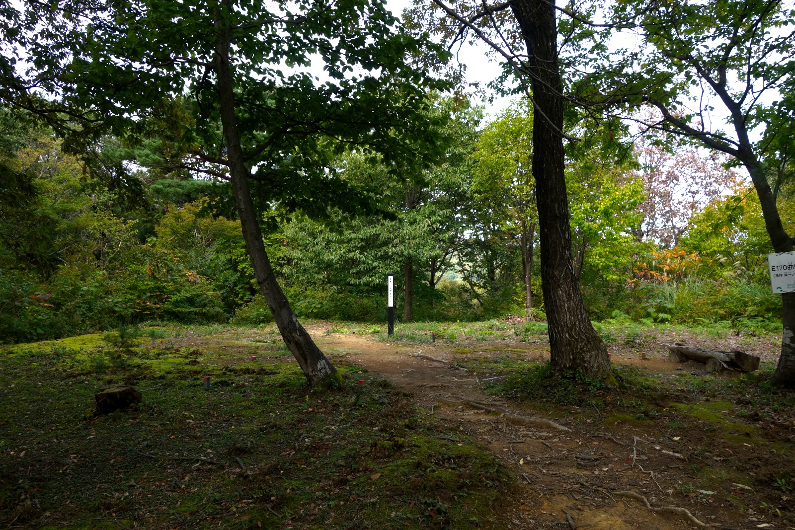 総合案内所を出発して約30分、広い場所に出てきました。ここはE170曲輪、通称・東一ノ丸跡です。座れそうな椅子…の残骸?があったのでここでちょっと休憩します。実は2025年4月に熊が目撃されたのはこの東一ノ丸付近なのだそうです。それ以来約半年目撃されていないようですし、目撃例があるから城址の中でここが特別危険というわけでもないのですが、まぁ気休めに、座っても熊鈴を鳴らし続けていました。