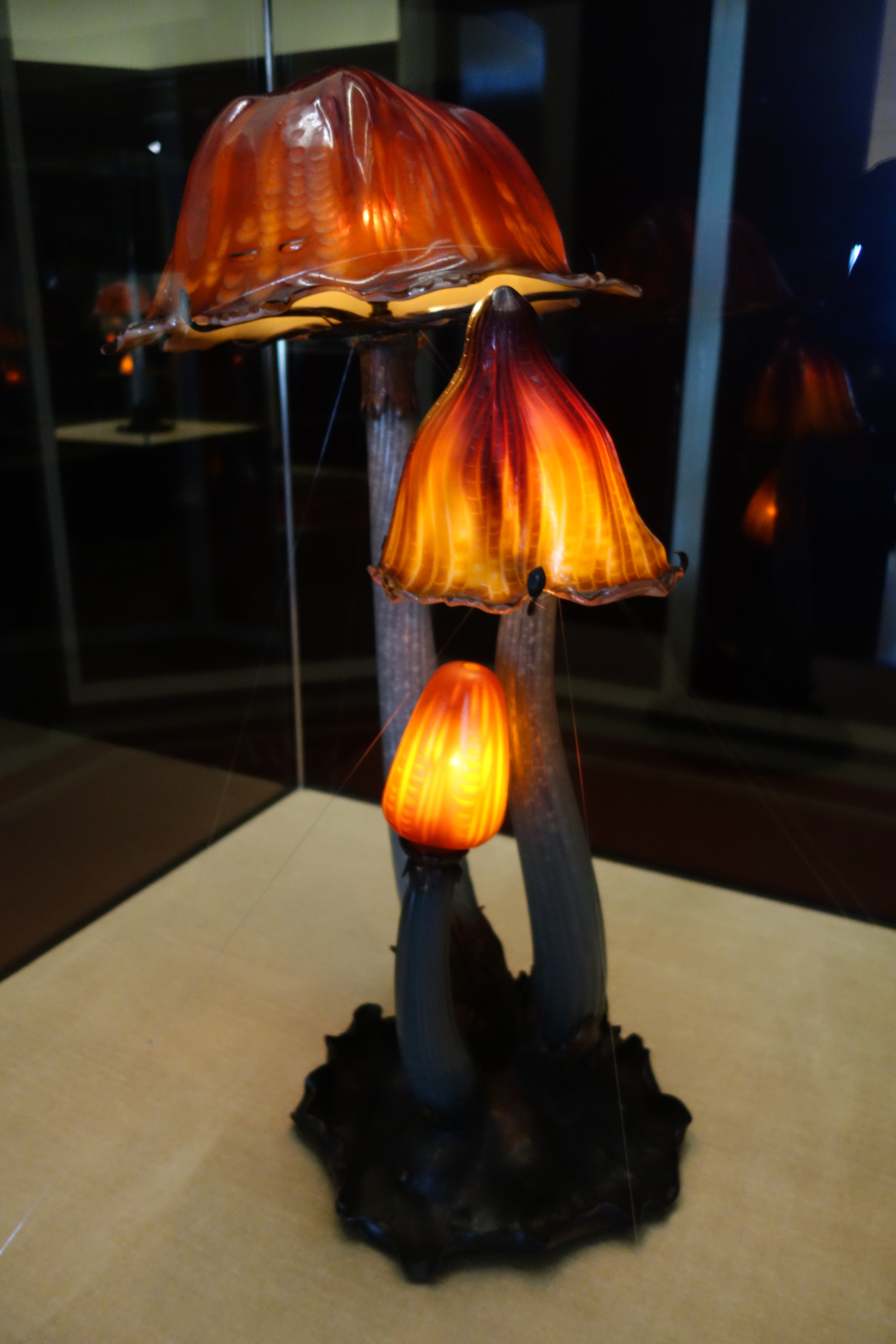 エミール・ガレの『ひとよ茸ランプ』。展示室に入ってすぐ、ガレの代表作の1つがお出迎え。高さの違う3本の茸が寄り添い合うデザイン。ガラスとは思えない、有機的で柔らかささえ感じる造形です。