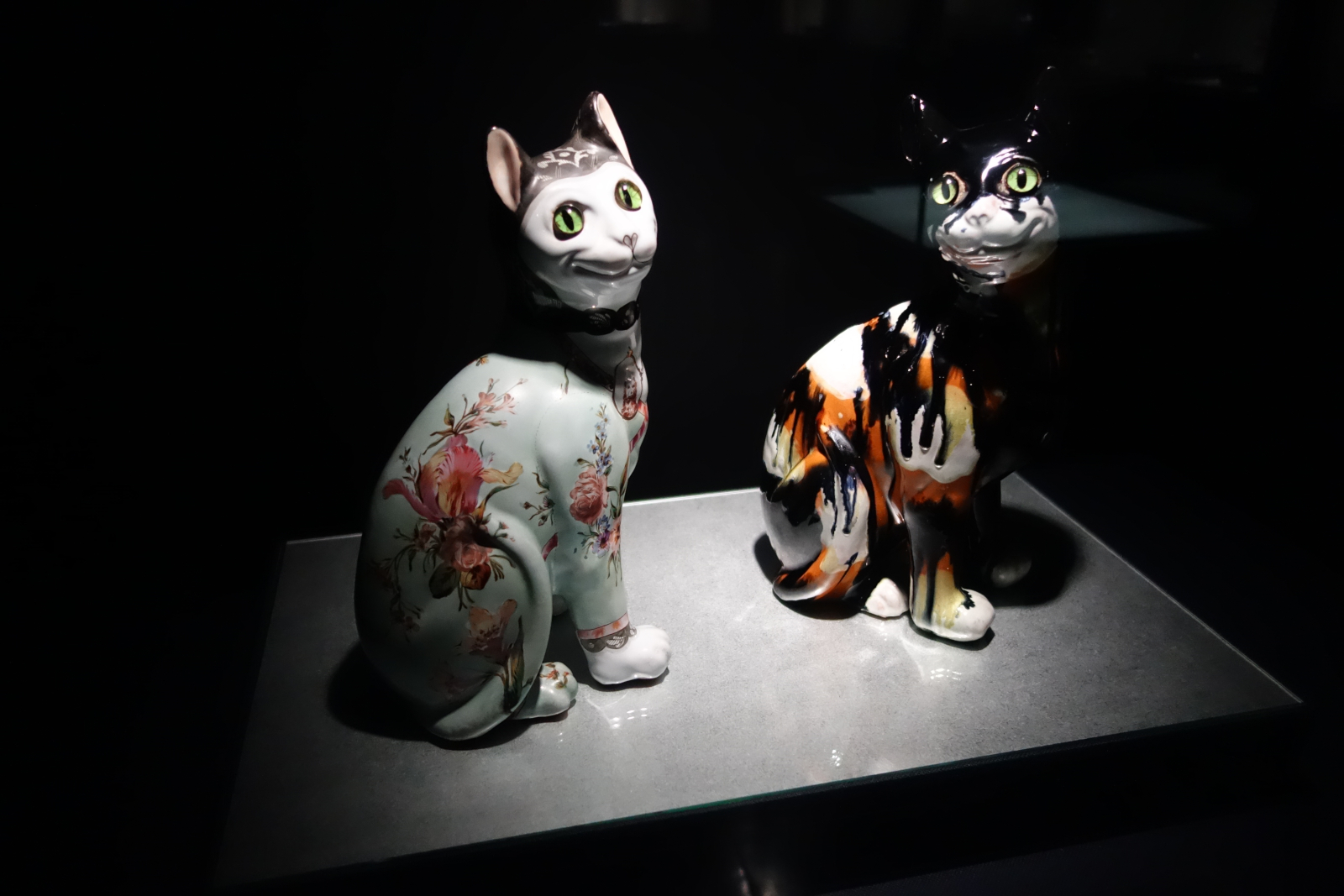 エミール・ガレの『ドレス姿の猫』(左)と『三毛猫』(右)。ガレの作品には生物をモチーフにしたものが多く、北澤美術館にも冒頭の茸を始め昆虫や鳥、魚などをあしらった作品が何点もあります。こちらは親しみやすいネコをモチーフとした作品2点を並べて展示したものです。左の猫は花柄のドレスを纏って首には黒いレースを巻き、つんとすました貴婦人のよう。よく観ると胸元のペンダントには犬が描かれています。右の猫は頭からペンキを被ったようなことになっていますが、これは日本の焼物の薩摩焼の三彩(三色の釉薬を使う技法)を真似て作ったのだそうです。