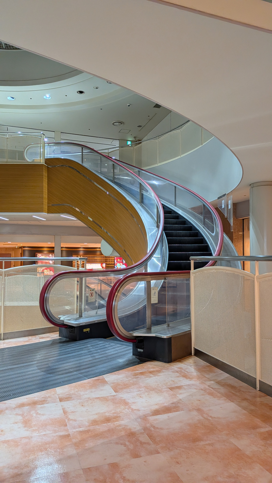 10~11階の間は、珍しい(日本国内で20施設くらい、全世界でも40施設くらいしか設置していないらしい)、カーブしながら昇降するスパイラルエスカレータで結ばれています。僕の普段の行動圏では横浜のランドマークプラザにありますが、それ以外では初めて見ました。エレベータで11階のレストランフロアに行ったのに、エスカレータが目に入った途端、思わず10階まで降りて、また昇ってしまいました(笑)。