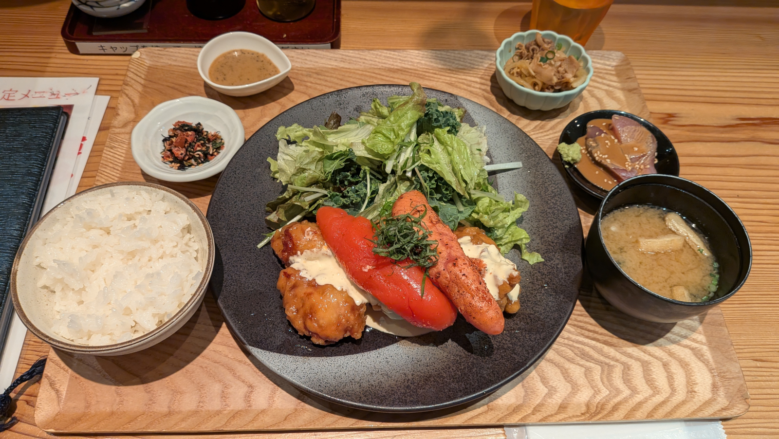 極W明太チキン南蛮定食 2,915円。チキン南蛮に福岡名物の明太子、しかも生と炙りの2本をのせた、なんとも豪快というか派手な定食です。メインの他、ご飯・味噌汁・豚酢モツ・ケールサラダ・刺身・ふりかけがついています。どれも美味しい!