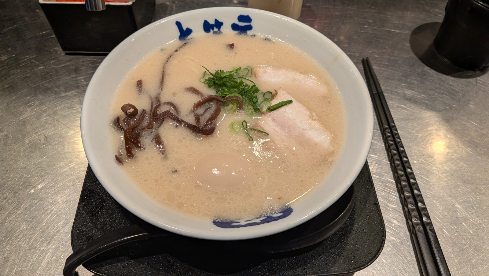 久留米城の見学後、JRの久留米駅にたどり着いた頃には雨のせいですっかり身体が冷え切ってしまいました。昼食抜きで動いていたこともあり、博多に戻る前になにか食べよう…と思ったのですが、西鉄の久留米駅前に較べてJR久留米駅周辺はあまり店がないんですね…。結局、駅と接続しているフレスタ久留米という商業施設内で 満一ゴールドレーベル という店を見つけて突入。久留米はとんこつラーメン発祥の地、やはり食べておかなくては(笑