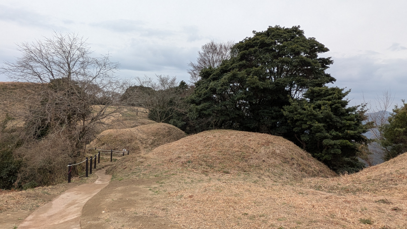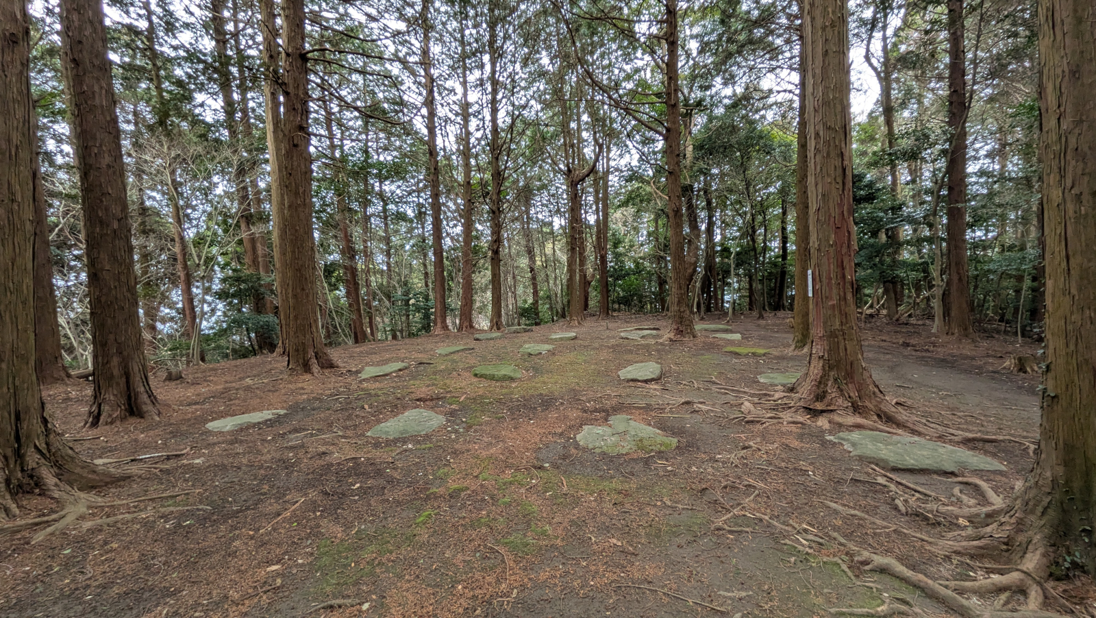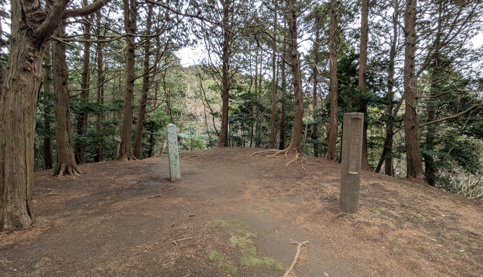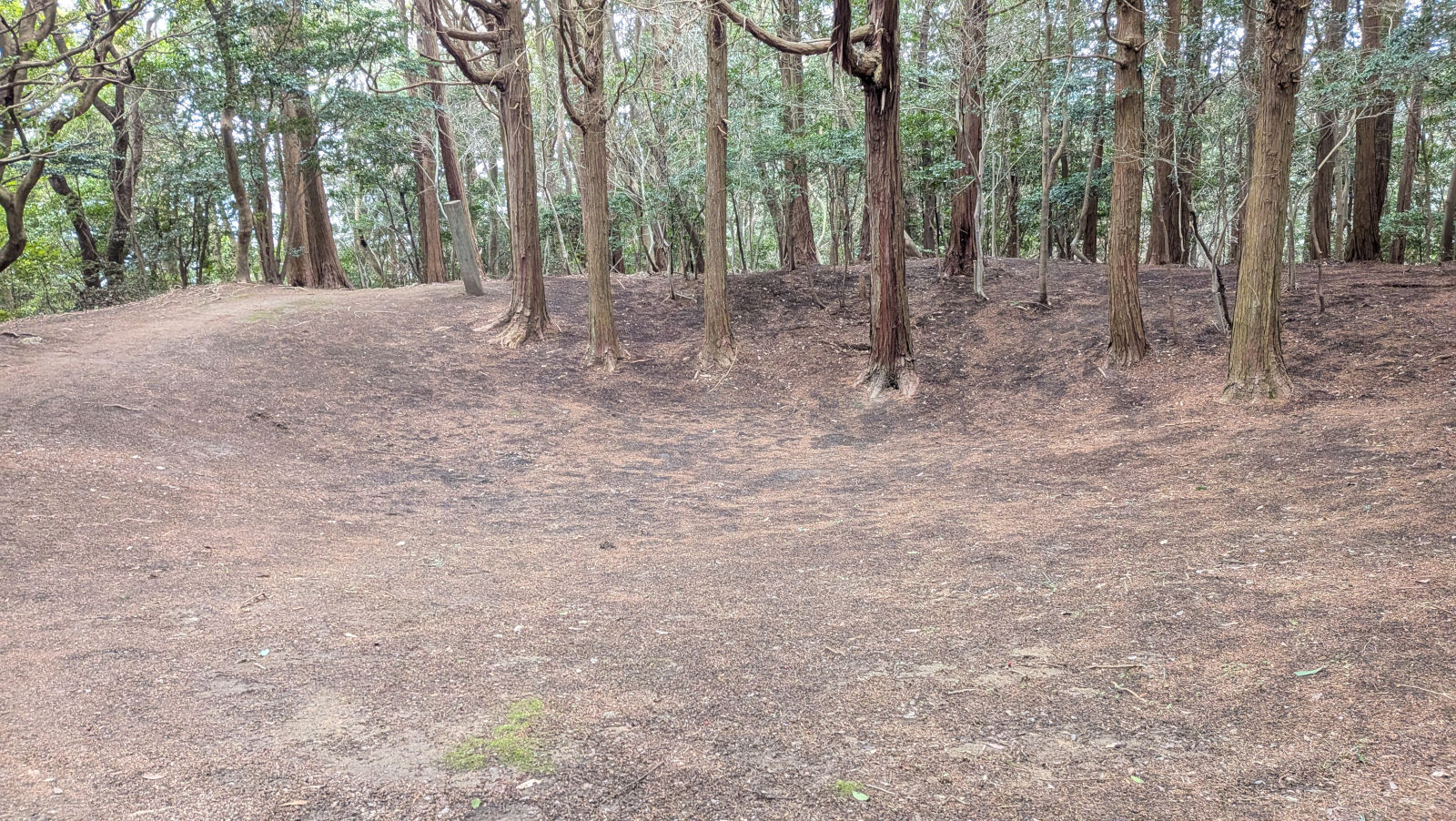 このあたりは東峰の最頂部です。写真だと判りにくいのですが、地面に直径18mほどの窪んだ部分があります。貯水池または烽火の跡だと考えられています。