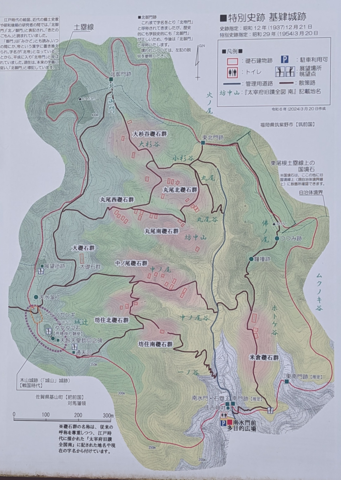 そこでオススメしたいのが、基山町草スキー場からのアクセスです。こちらも駐車場とトイレがあり(しかも温水洗浄つき)、標高が高い位置でほんの数分登れば山頂です。ここから尾根を周りながら以降を見学していき、最後に南水門まで降りていけば体力的には楽に見学できます。