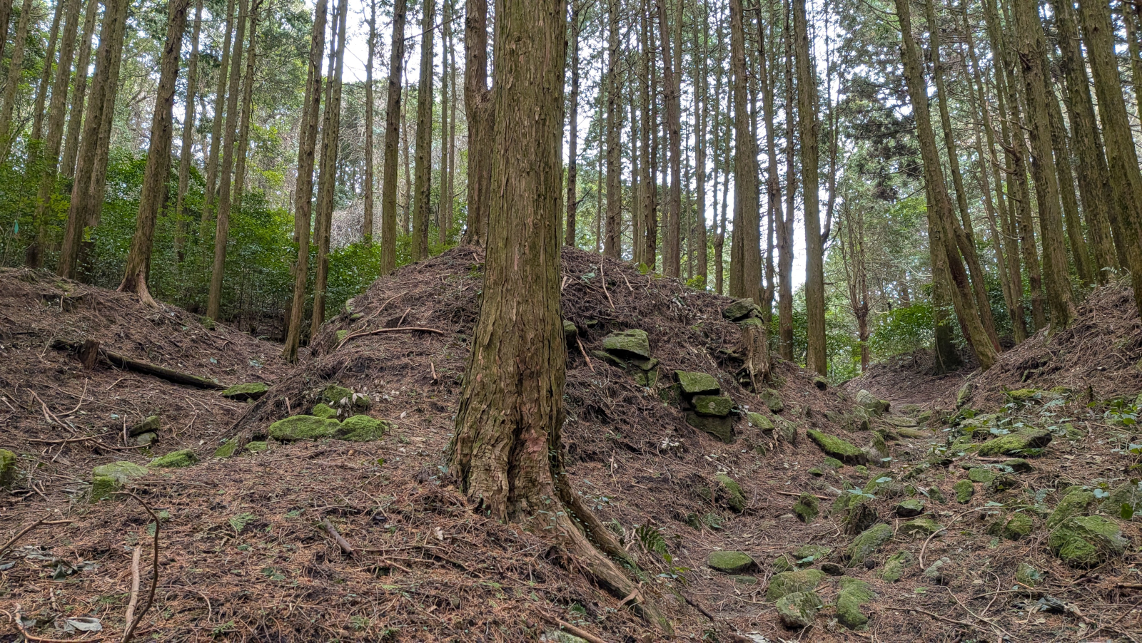 北帝門から東北門へ向かう途中、大杉谷礎石群を経由しました。礎石と言いつつ、広い範囲に石が散乱している状態で、どのような建物が建っていたのかまったく判りません。一部には石積みのようなものも見えます。