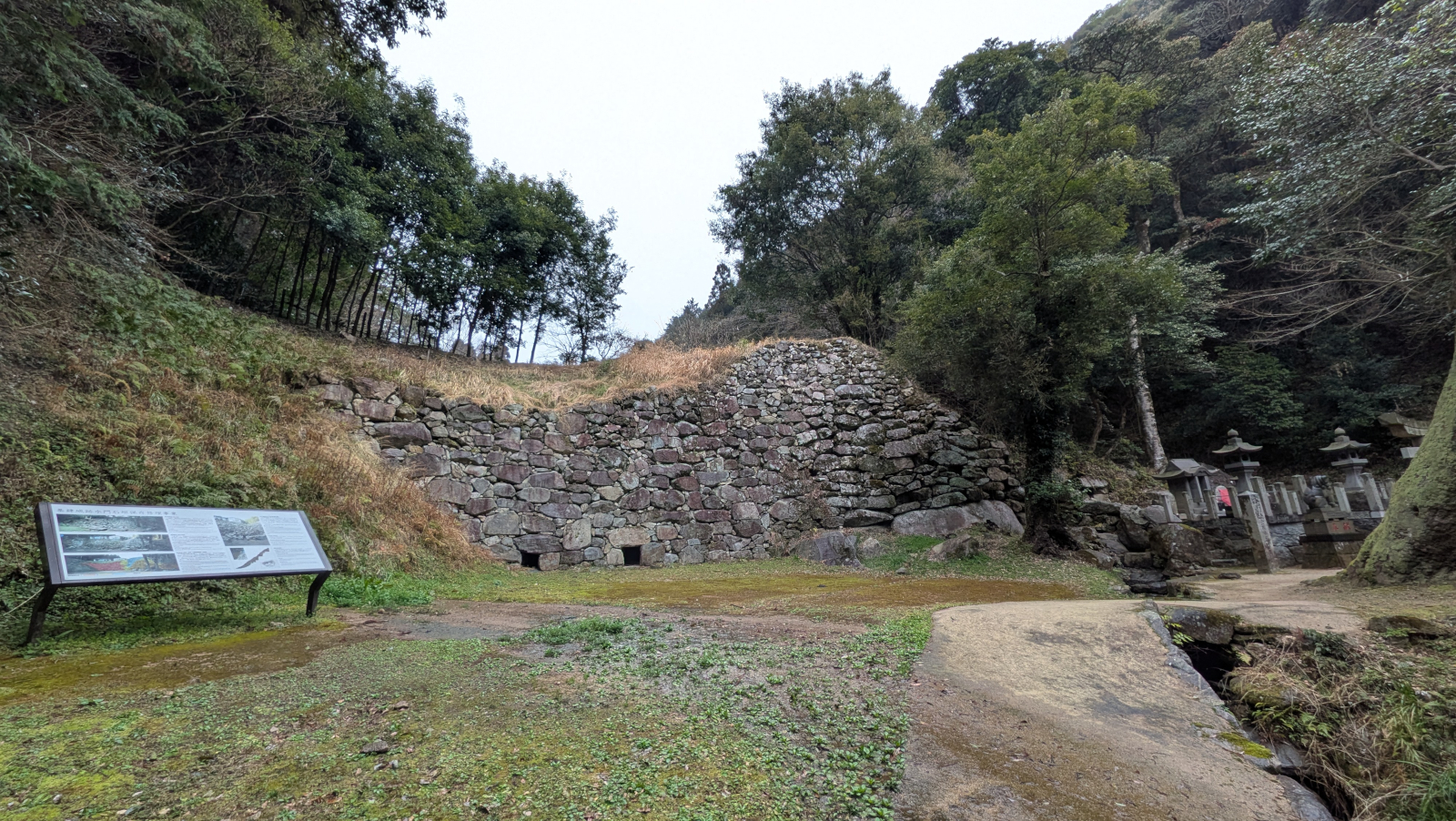 南門、今回のゴールです。ここも東南門と同様、谷部を塞ぐように石塁が築かれていますが、こちらの方がずっと判りやすいですね。長さ26m、高さ8.5mもあります。