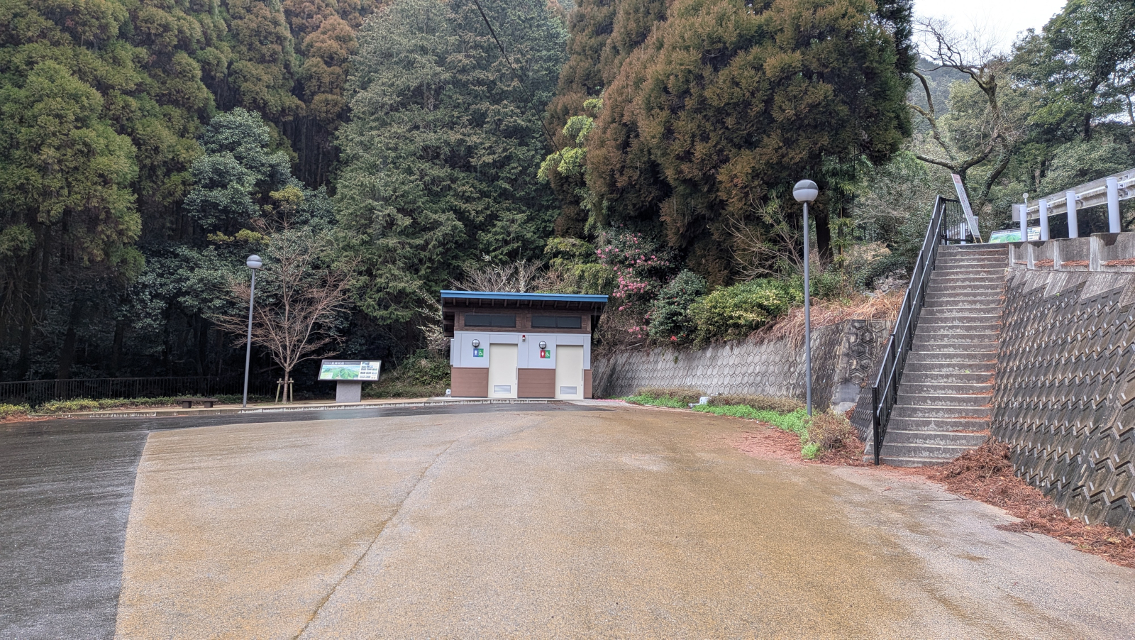 南門のすぐ下には駐車場とトイレがあります。電話でタクシーを呼んで駅に向かいました…途中で続100名城スタンプのある基山町民会館に寄ってもらい、駅まで2,000円ちょっとでした。