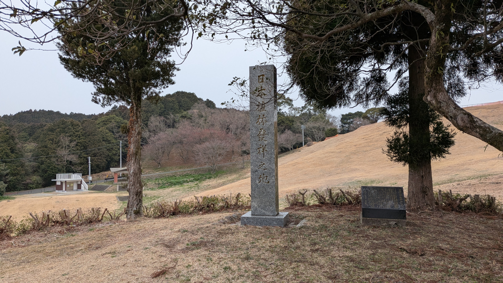 城とは関係ありませんが、登城路途中にあった『日本植林発祥の地』の碑です。その背後に見える斜面がたぶん草スキー場ですね。