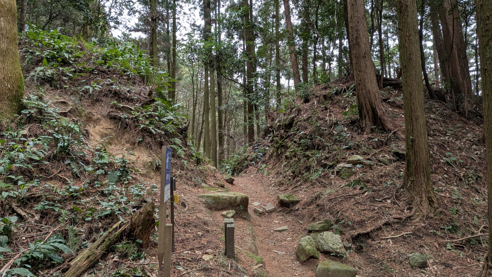 城名碑、奥には休憩所兼見晴台が見えます。この写真の奥方向に土塁が続いています。土塁に沿って北上して門跡を目指すか、写真右手の斜面を下って山中にある礎石群(建物跡)を目指すか、このあたりで道が分かれています。