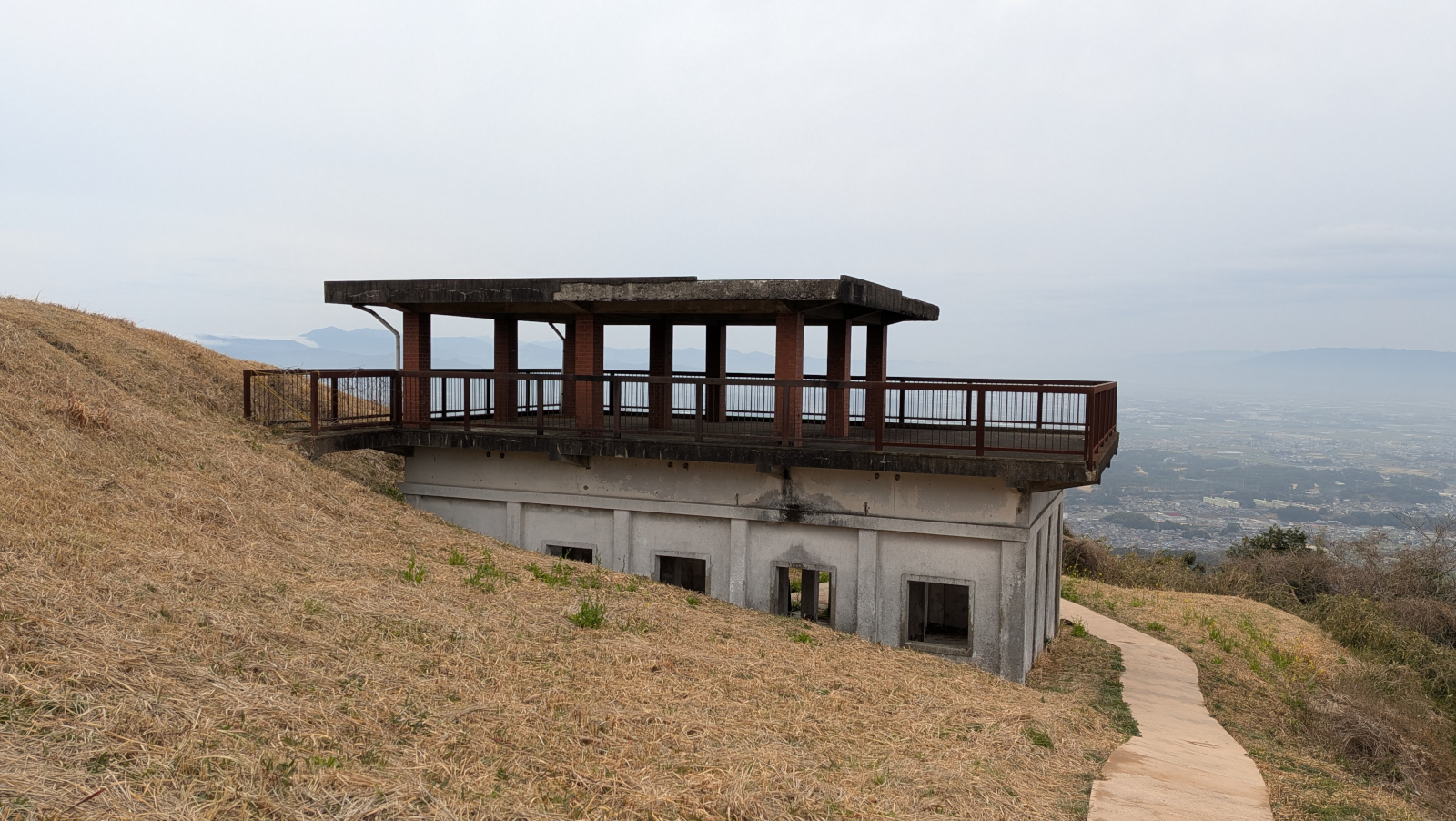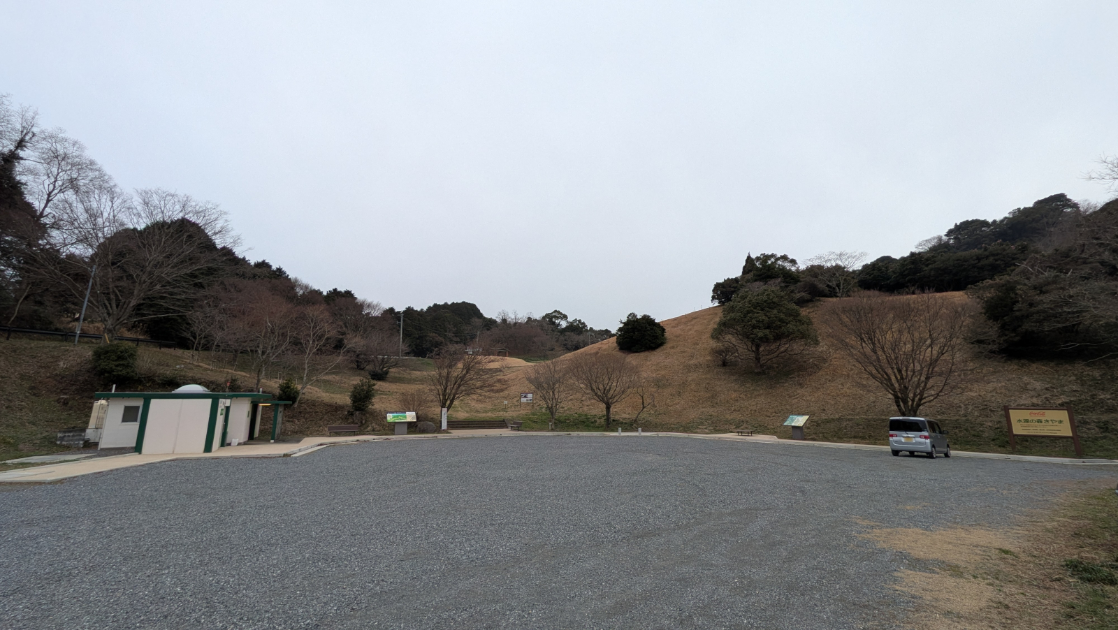 というわけで、基山町草スキー場駐車場にやってきました。JR基山駅からタクシーで2,000円ほどでした。いまは草スキーのシーズンではないようですが、写真正面奥から右手に大きな斜面があったので、おそらくそこが草スキー場なのだと思います。